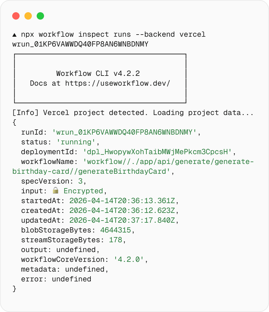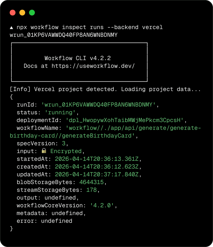 npx workflow inspect runs <wrun_id> This works locally with no config. For production deployments on Vercel, the CLI reuses your vercel CLI authentication with --backend vercel to make authenticated requests against the Vercel API. Agents can investigate state, inspect runs, and debug behavior without leaving the terminal.