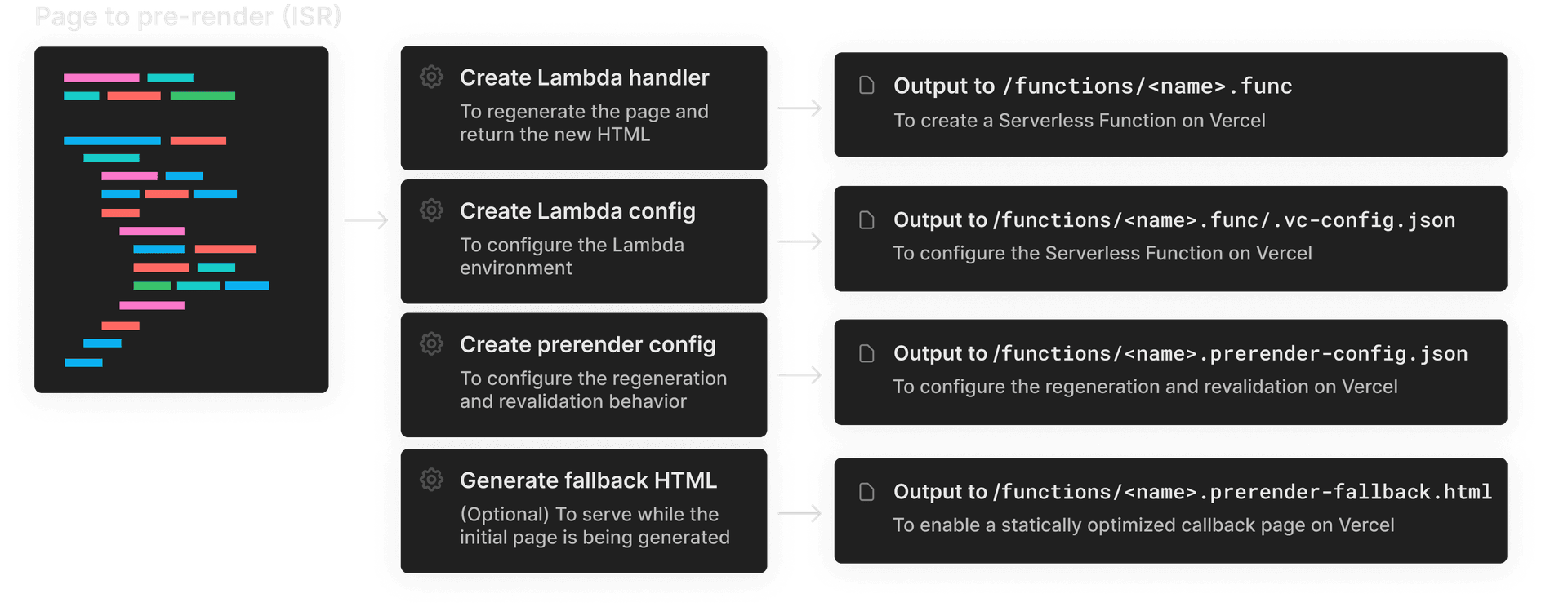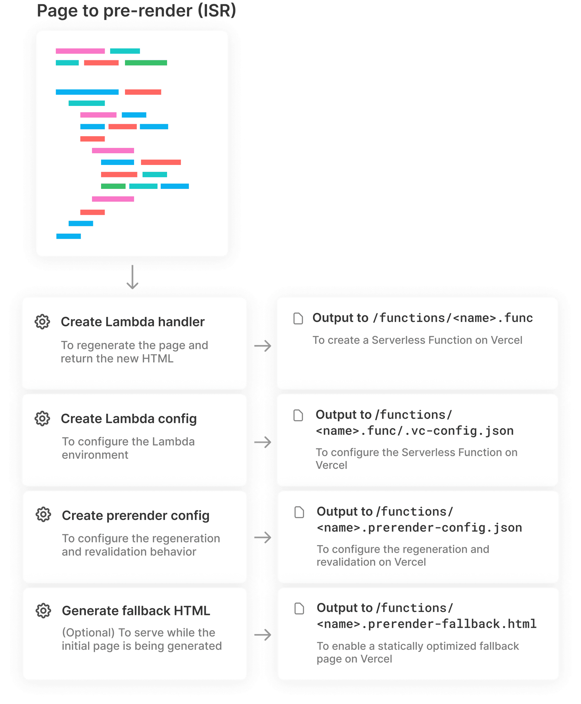 Right now, the createPrerender function takes care of creating the Serverless Function, creating a static prerender-fallback.html fallback file by statically rendering the component at build time, and generating a prerender-config.json configuration file that includes the necessary information the Build Output API needs to configure the prerendering behavior, such as the expiration value.