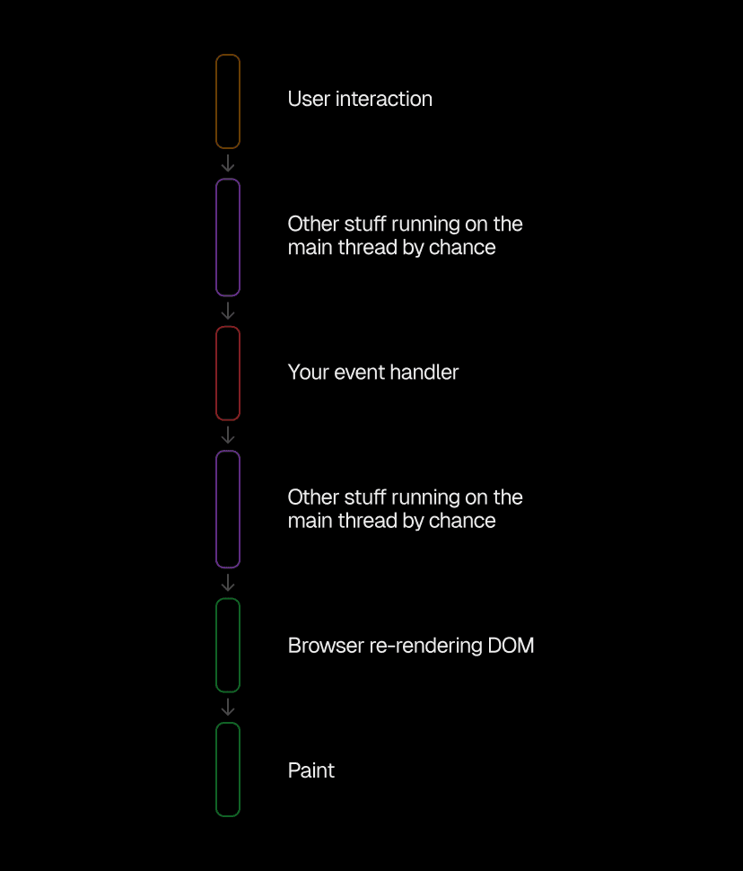 <html> <button onClick={() => { blockTheMainThreadForOneSecond(); }} > Click me </button></html>;The main takeaway is that, to optimize INP, our job is to arrange the work we’re giving to the browser such that it gets a chance to paint and react to user action. What it does not mean is that we always have to get all the work done, that we eventually want to do within the 200ms INP deadline.