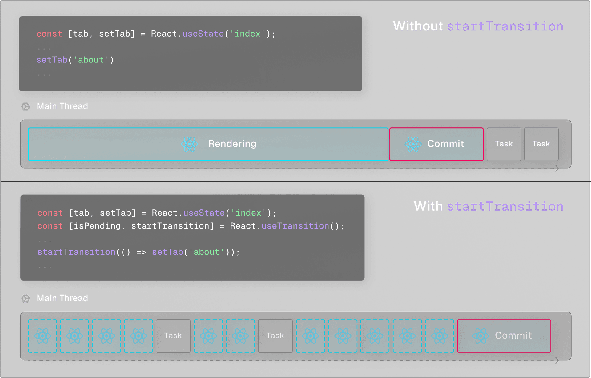 return ( <button onClick={() => { urgentUpdate(); startTransition(() => { nonUrgentUpdate() }) }} >...</button> )}When a transition starts, the concurrent renderer prepares the new tree in the background. Once it’s finished rendering, it’ll keep the result in memory until the React scheduler can performantly update the DOM to reflect the new state. This moment could be when the browser is idle and a higher priority task (like user interaction) isn't pending.