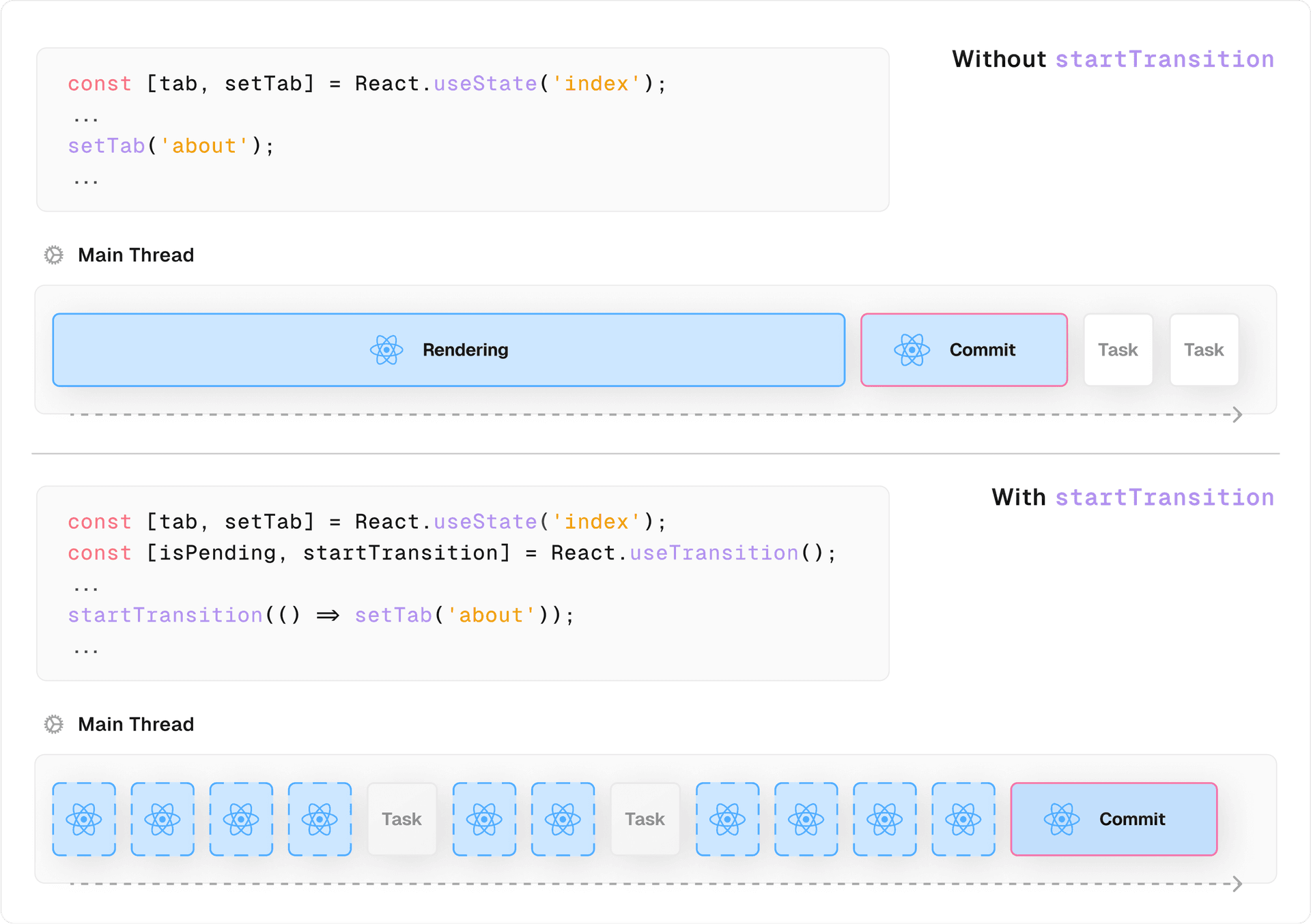 By wrapping a state update in startTransition, we can tell React that we’re okay with deferring or interrupting the rendering to prioritize more important tasks to keep the current user interface interactive.