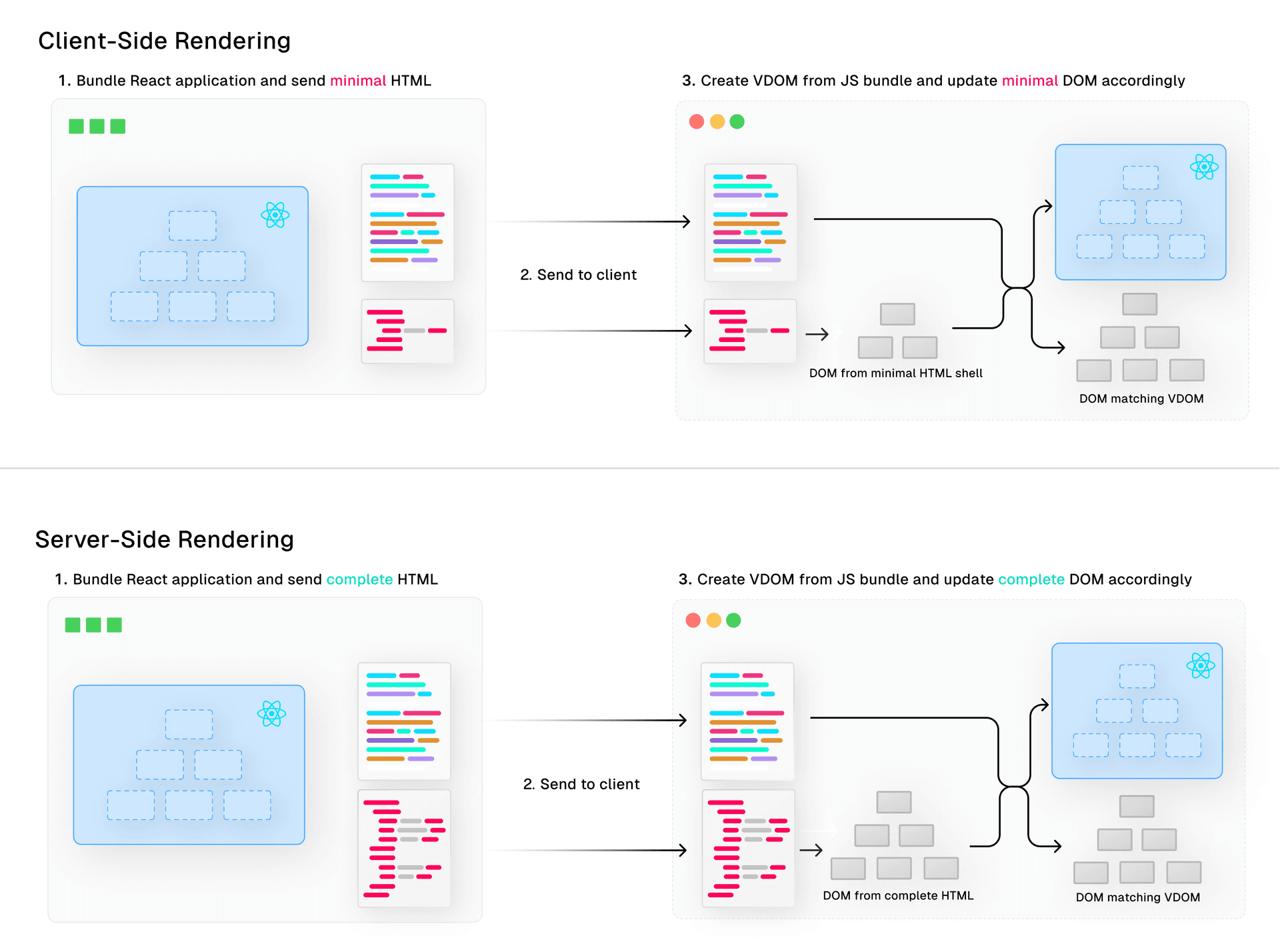 Traditionally, React offered a few primary ways to render our app. We could either render everything entirely on the client (Client-Side Rendering), or we could render the component tree to HTML on the server and send this static HTML to the client with a JavaScript bundle to hydrate the components client-side (Server-Side Rendering).