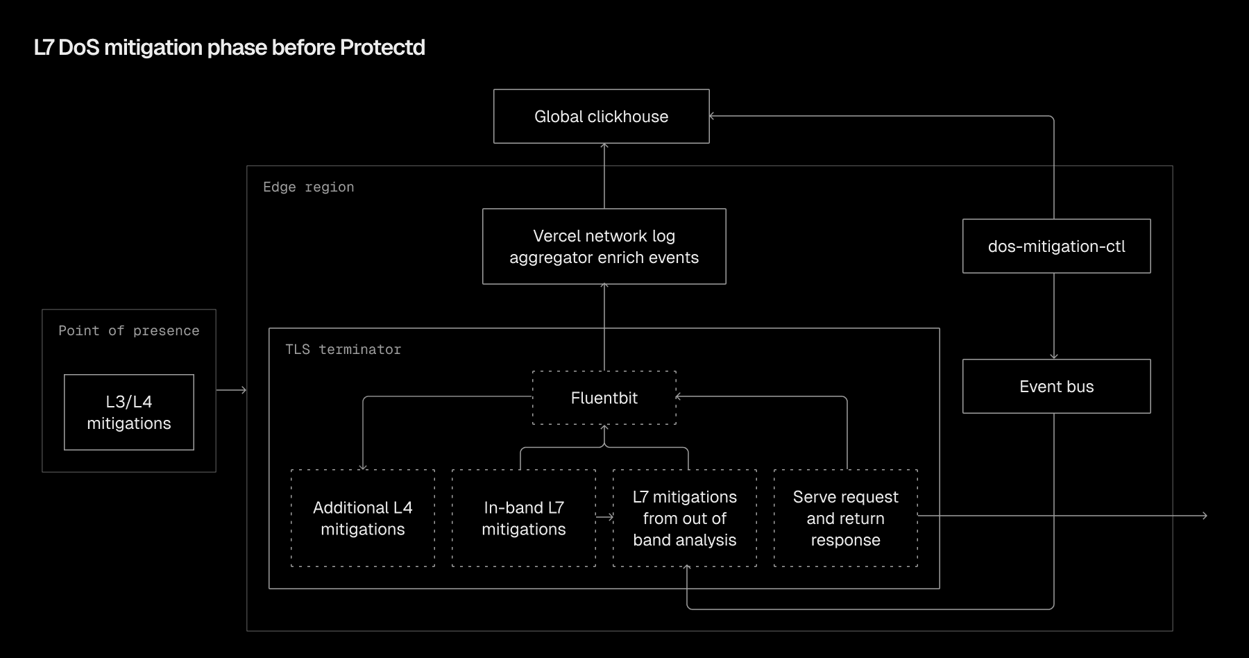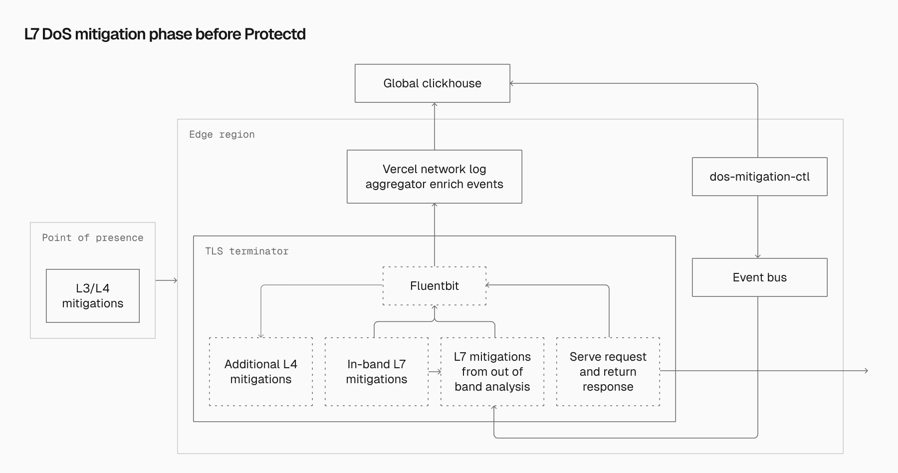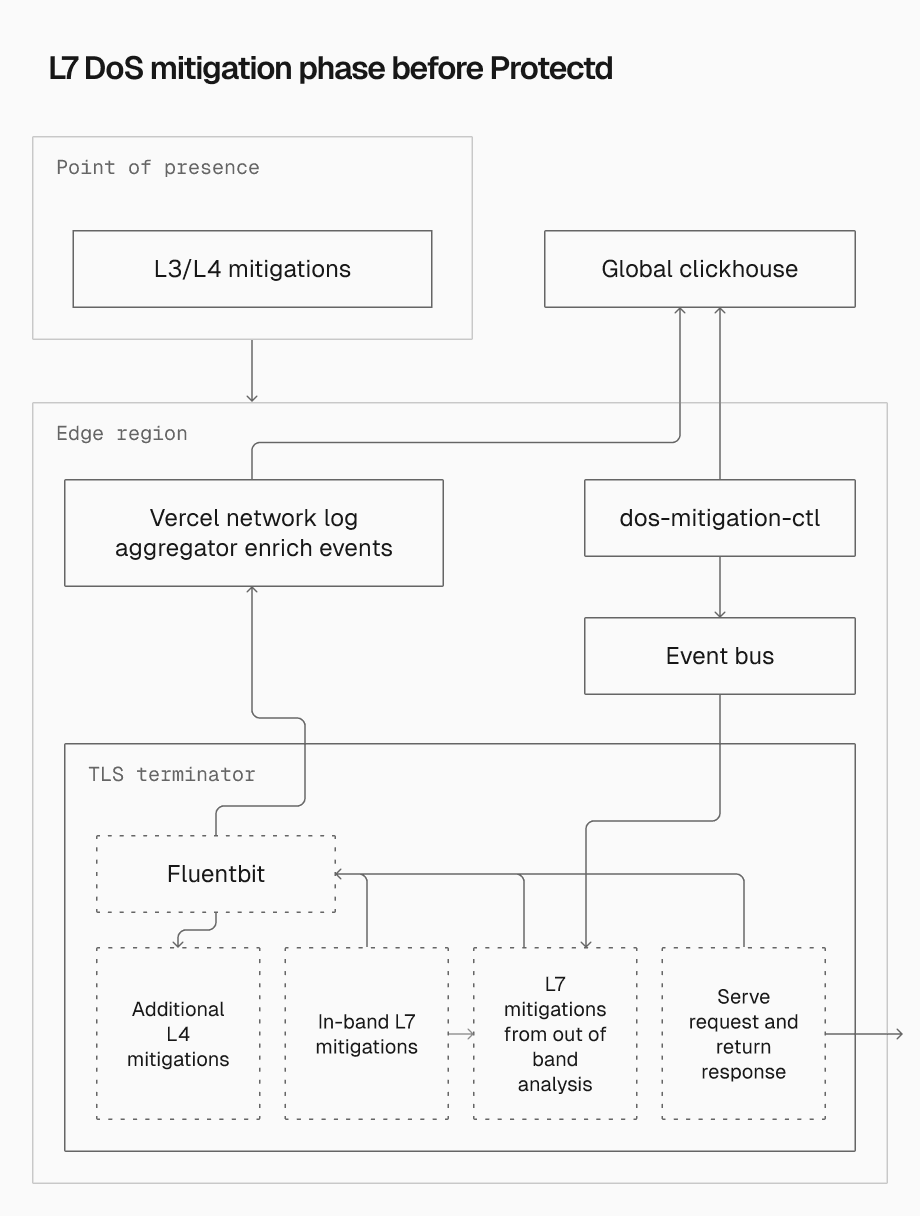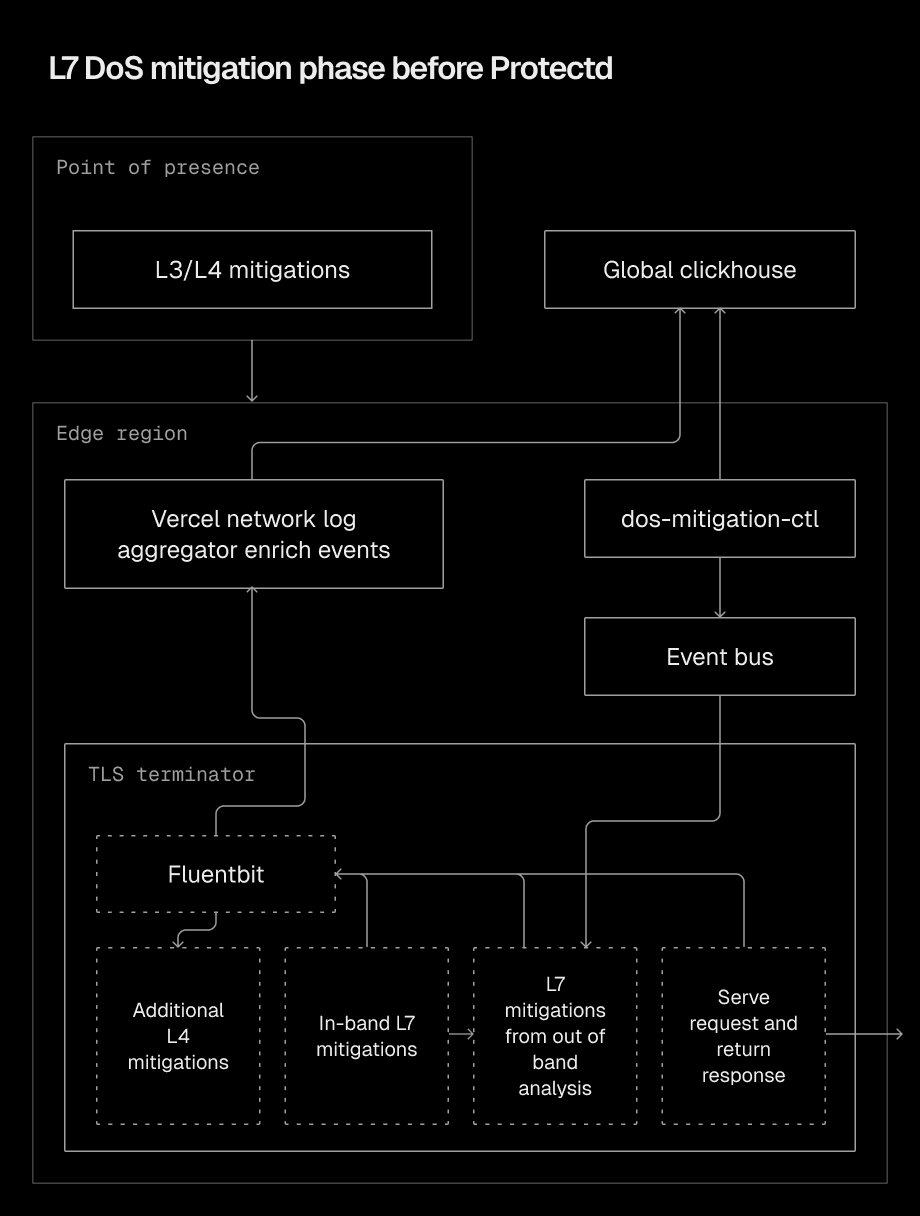 This original system reliably filtered high volumes of traffic and successfully mitigated a wide range of DoS attacks, but faced limitations. For out-of-bound mitigations, time to mitigation (TTM) often exceeded 20 seconds in our old system. When roughly 85% of all L7 protections depend on this pipeline, each passing second carries consequences. Vercel's infrastructure easily absorbs L7 floods, but prolonged attacks risk overwhelming customer backends and generating unwanted usage.