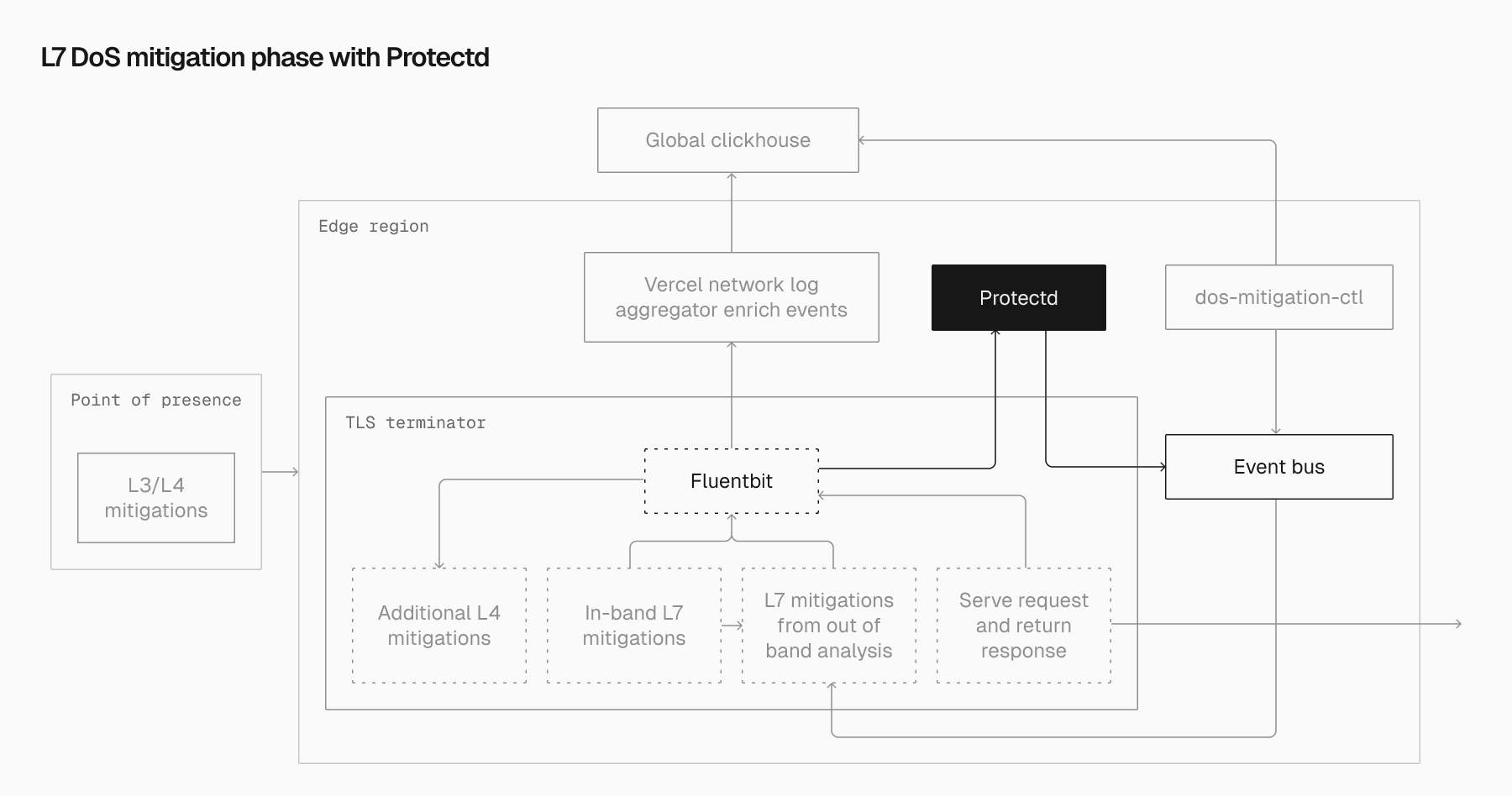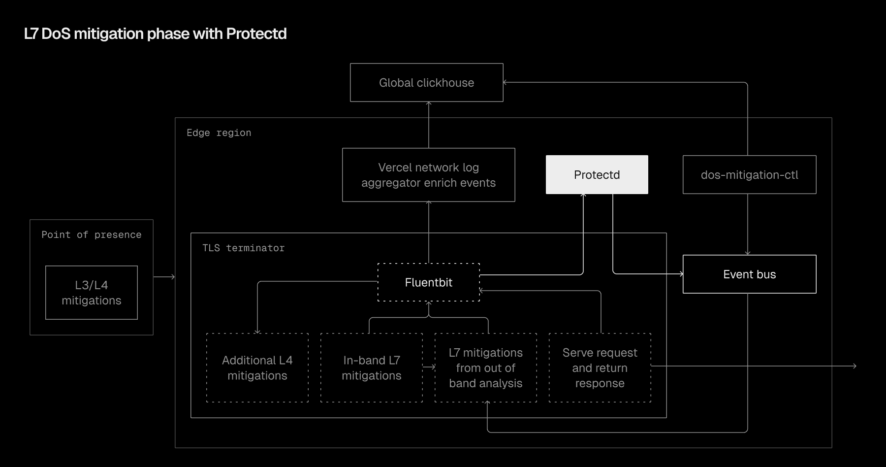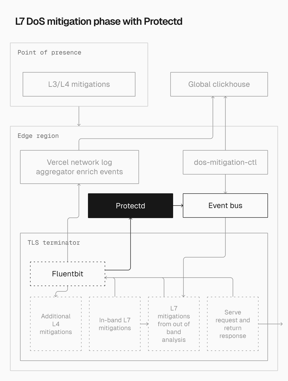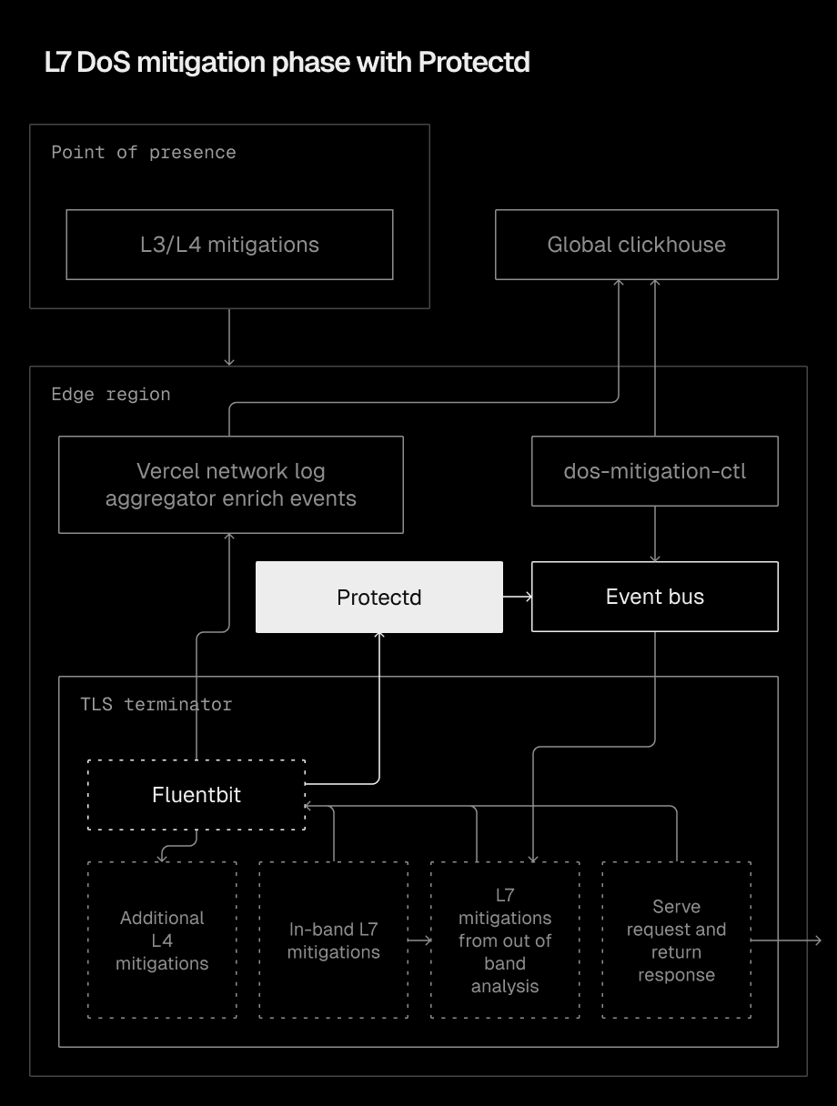 When Protectd identifies a suspicious pattern, it pushes defensive signatures directly to the event bus within the same Vercel region. These signatures are quickly enforced by all TLS terminators. By keeping detection and enforcement at the edge, Protectd enables rapid TTM while building a dynamic understanding of underlying attack patterns.