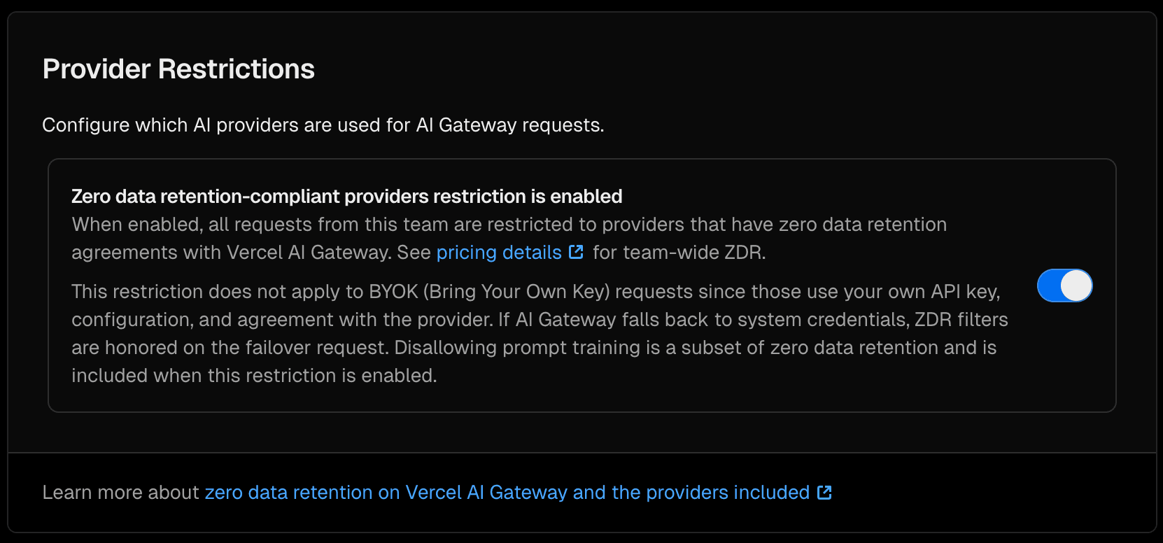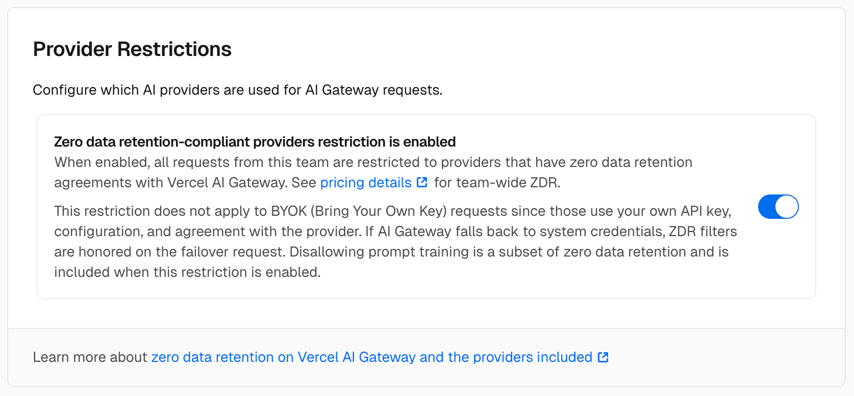const result = streamText({ model: 'anthropic/claude-sonnet-4.6', prompt: 'Analyze this sensitive business data and provide insights.', providerOptions: { gateway: { zeroDataRetention: true, } satisfies GatewayProviderOptions, },});Team-wide and per-request settings work together. If either is enabled, ZDR is enforced.