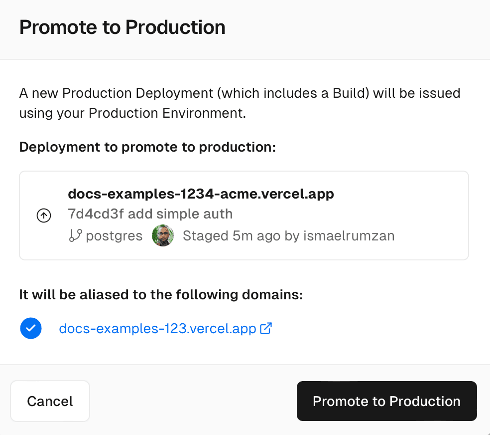 There may be times when you need to promote an existing preview deployment to production, such as when you need to temporarily use a branch that isn't set as the production branch.