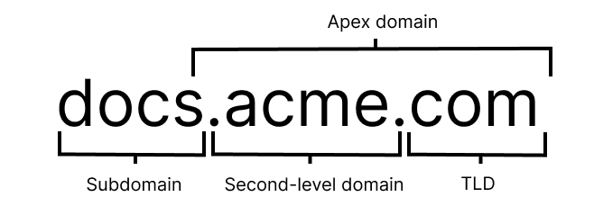 A subdomain is a more specific part of that domain that can be assigned to a particular part of your site, for example, blog.acme.com, help.acme.com. This helps to blend both your brand, with the specificity of where the user may need to go. To add a subdomain to your Project, follow the instructions in the Add a custom domain doc. If you have bought the domain through Vercel, you can also point a subdomain to an external service through the Domains section of the dashboard. Subdomains are set through a CNAME DNS record.