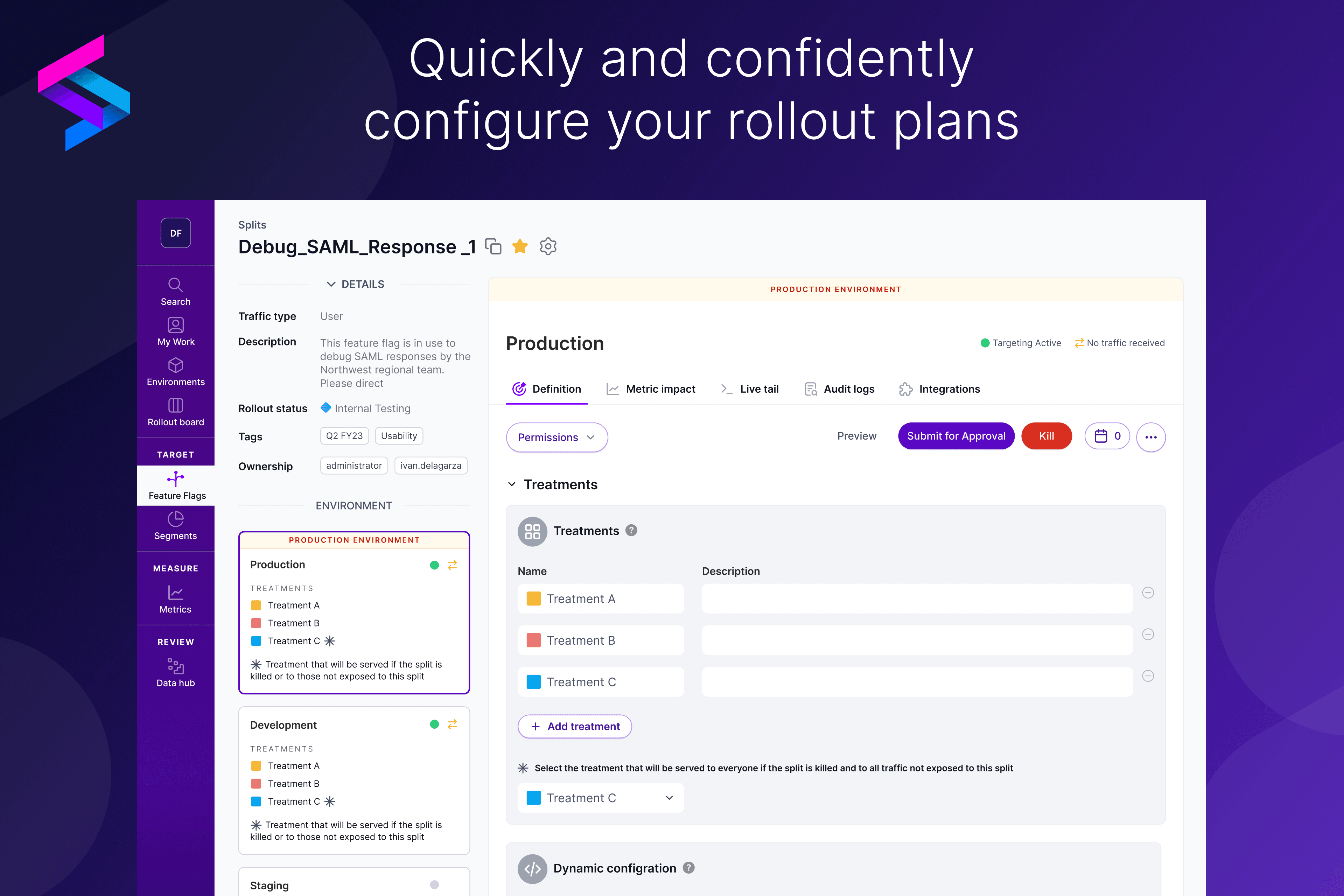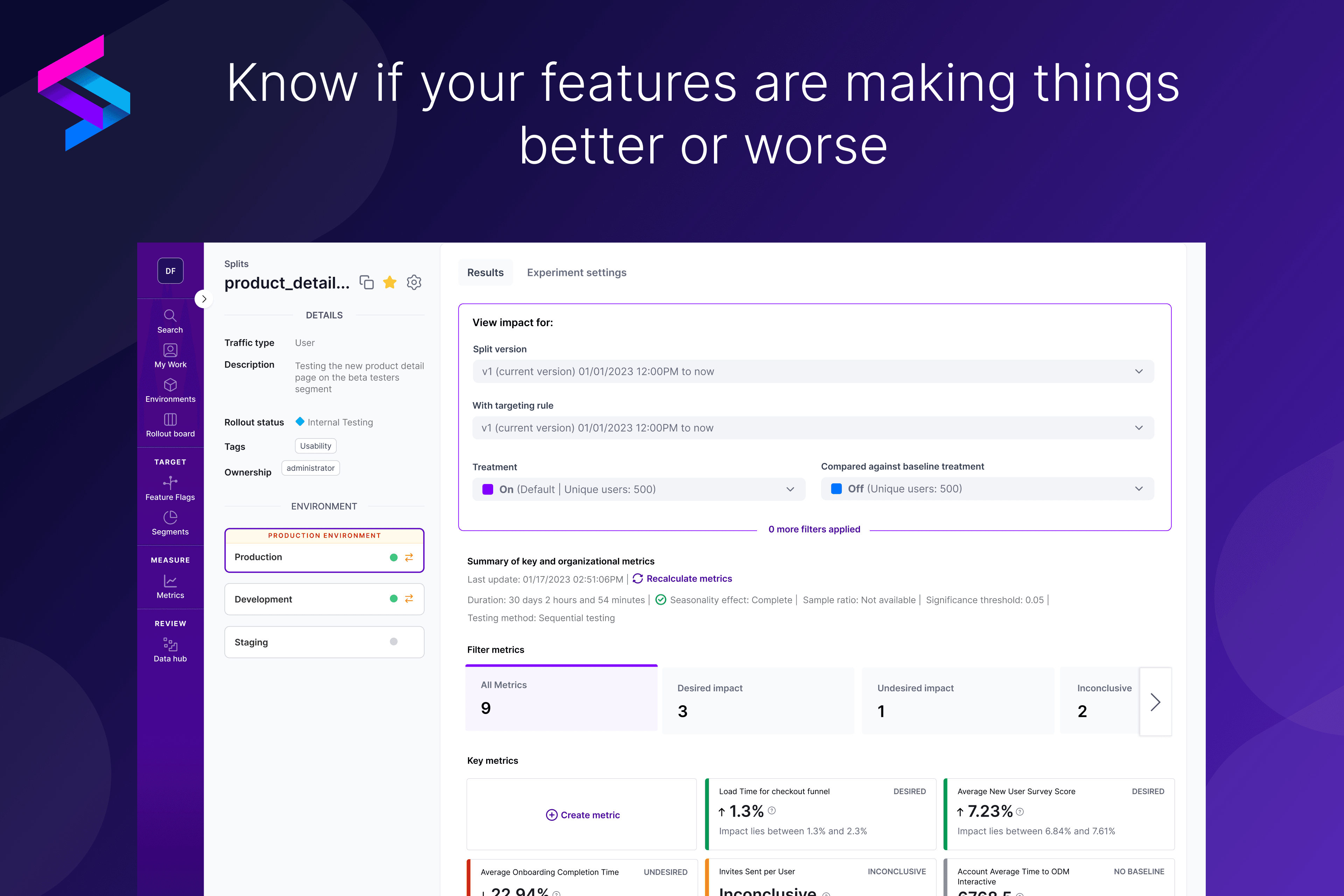Pair the speed and reliability of Split’s feature flag with data to safely launch your releases and experiments.