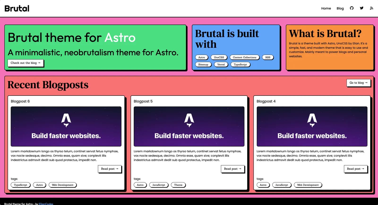 Brutal is a minimal neobrutalist theme for Astro. It's based on Neobrutalist Web Design, a movement that aims to create websites with a minimalistic and functional design. It has some integrations like Image Optimization, RSS, Sitemap, ready to get your SEO done right.