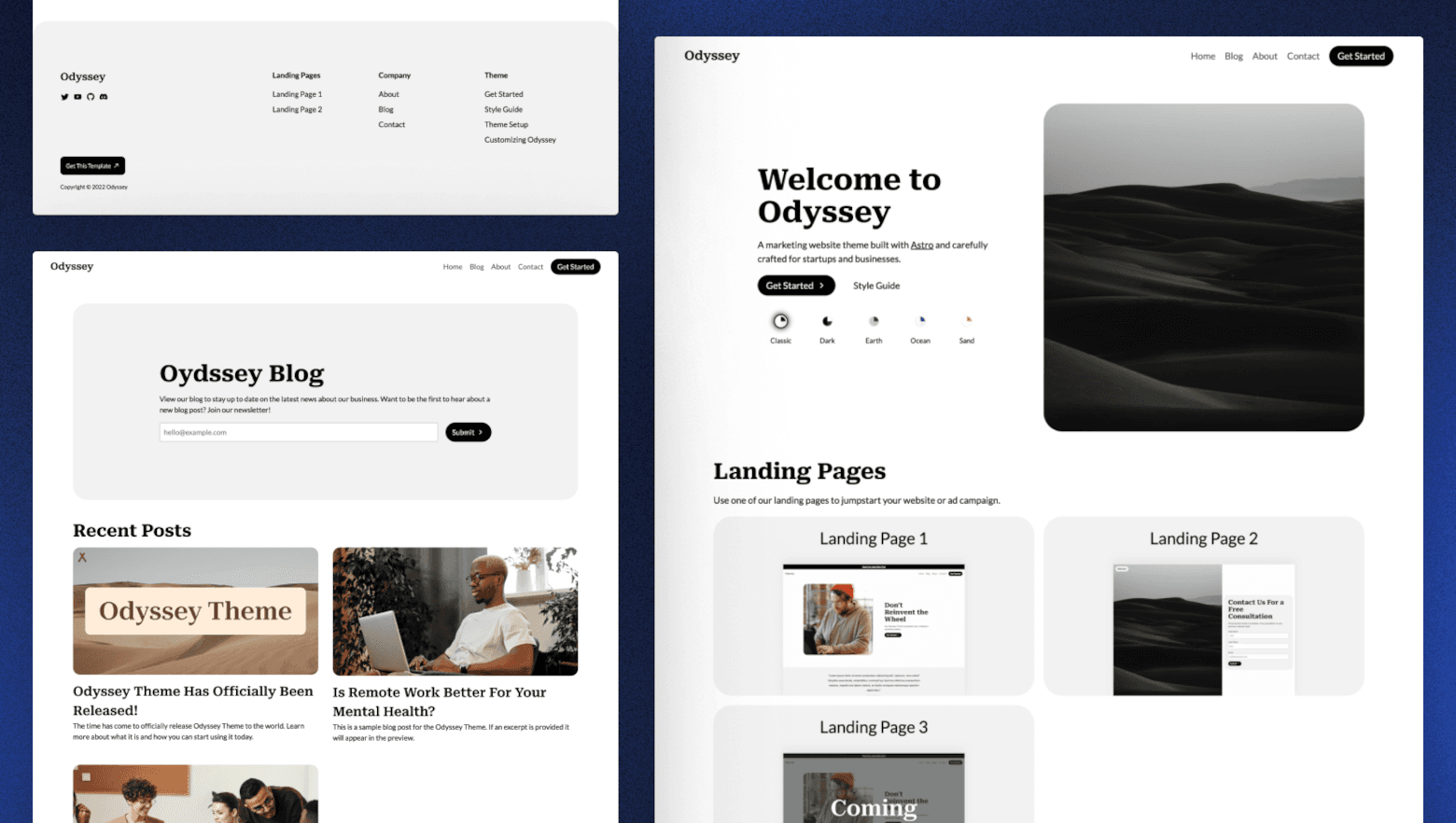 Odyssey Theme is a modern theme/starter for a business or startup's marketing website. It provides landing page examples, a full-featured blog, contact forms, and more. It is fully themeable to match your business' branding and style. It even includes a theme switcher component to show how easily the entire style of the site can be changed with only a few lines of CSS.
