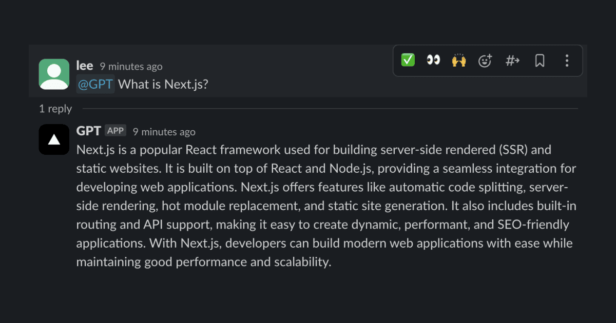 This is a Slackbot you can ask questions and get answers from OpenAI's GPT model.